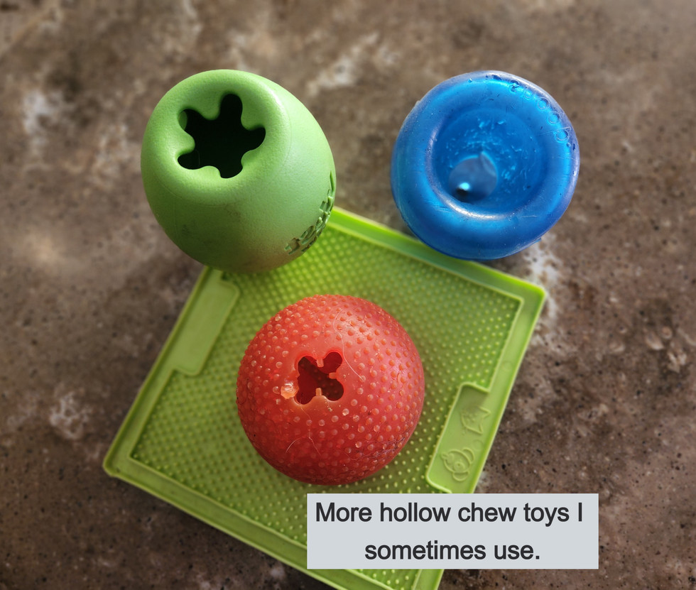 So this is what I do for one dog, but I actually always have at least 10 hollow chew toys frozen in the freezer.